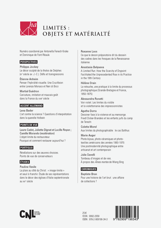 Numéro coordonné par Antonella Fenech Kroke et Dominique de Font-Réaulx / Sortie : décembre 2021 / 17 × 24 cm, 224 p., 119 fig. / ISBN : 978-2-909196-34-3 /// Ce numéro explore la manière dont création artistique et histoire de l’art sont façonnées par les limites, externes ou internes, dans les usages, les pratiques, la réception et l’étude des œuvres. Les objets ici considérés touchent aux limites de la discipline par leur statut marginal (dessins d’enfants, art brut, caricature et retouche photographique) ou à leur place dans l’œuvre d’artistes ou dans les corpus étudiés (cadres de la Renaissance, Madone de Holbein ou photographies de Balthus). Elle peut aussi tenir de leur nature composite, alliant matériaux et savoir-faire divers (sculptures peintes de Delphes, remplois de Neri di Bicci ou objets photographiques américains des années 1970), comme à la singularité qu’ils font naître dans notre regard (Christ-Porte, violettomanie impressionniste ou films de Wang Bing).