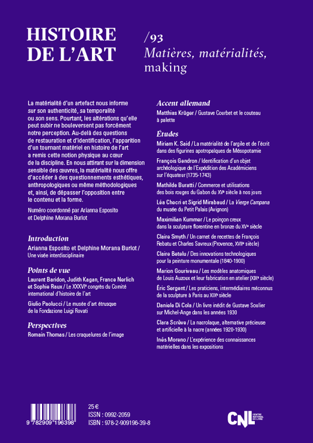 Numéro coordonné par Arianna Esposito et Delphine Morana Burlot | Juin 2024 | 17 × 24 cm, 216 p., 134 fig. | ISBN : 978-2-909196-38 ||| La matérialité d’un artefact nous informe sur son authenticité, sa temporalité ou son sens. Pourtant, les altérations qu’elle peut subir ne bouleversent pas forcément notre perception. Au-delà des questions de restauration et d’identification, l’apparition d’un tournant matériel en histoire de l’art a remis cette notion physique au cœur de la discipline. En nous attirant sur la dimension sensible des œuvres, la matérialité nous offre d’accéder à des questionnements esthétiques, anthropologiques ou même méthodologiques et, ainsi, de dépasser l’opposition entre le contenu et la forme.