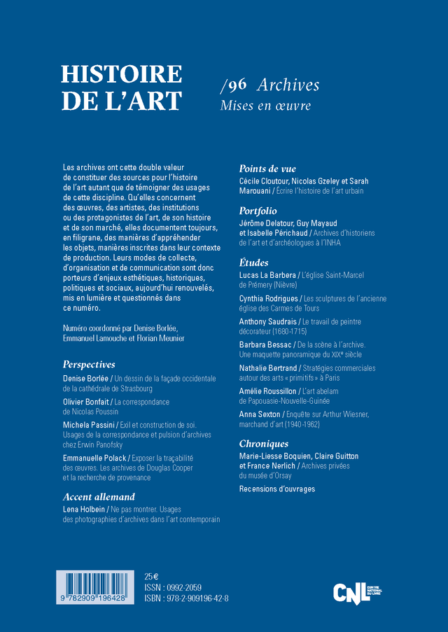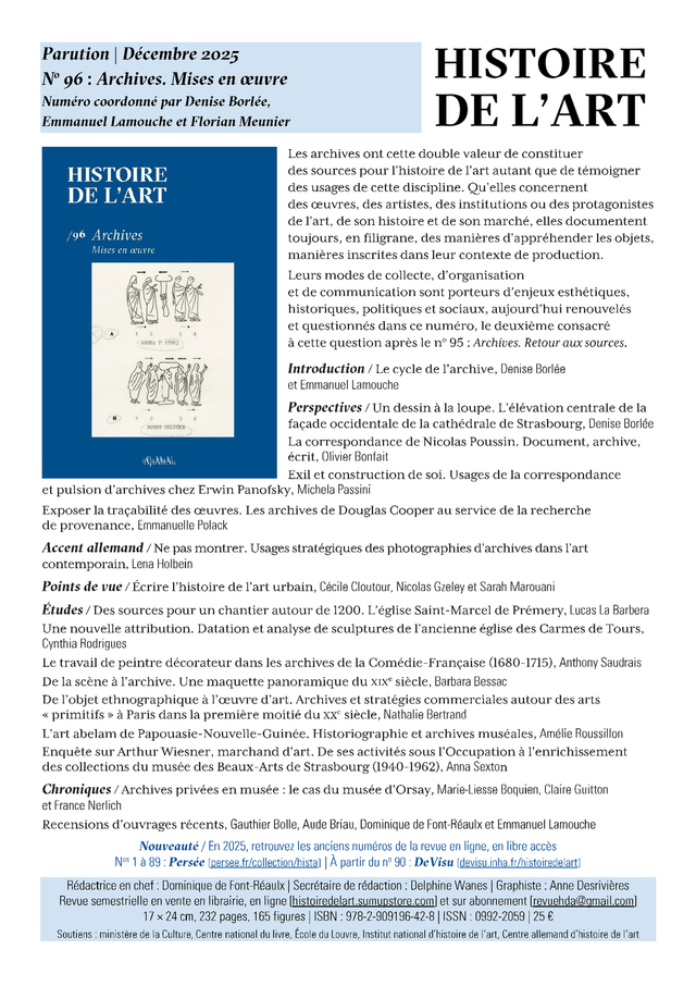 Les archives ont cette double valeur de constituer des sources pour l’histoire de l’art autant que de témoigner des usages de cette discipline. Qu’elles concernent des œuvres, des artistes, des institutions ou des protagonistes de l’art, de son histoire et de son marché, elles documentent toujours, en filigrane, des manières d’appréhender les objets, manières inscrites dans leur contexte de production. Leurs modes de collecte, d’organisation et de communication sont porteurs d’enjeux esthétiques, historiques, politiques et sociaux, aujourd’hui renouvelés et questionnés dans ce numéro, le deuxième consacré à cette question après le n° 95 : Archives. Retour aux sources.